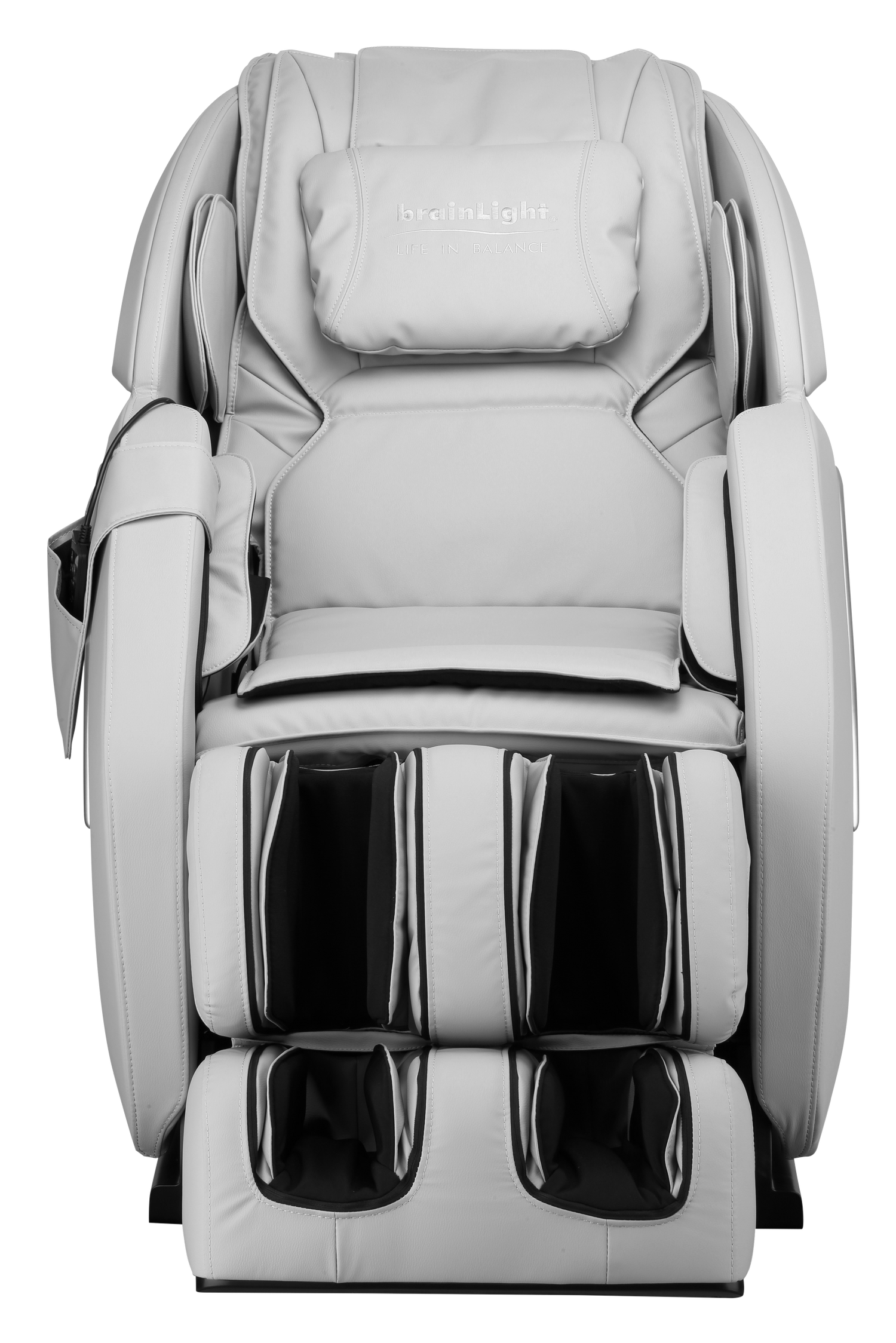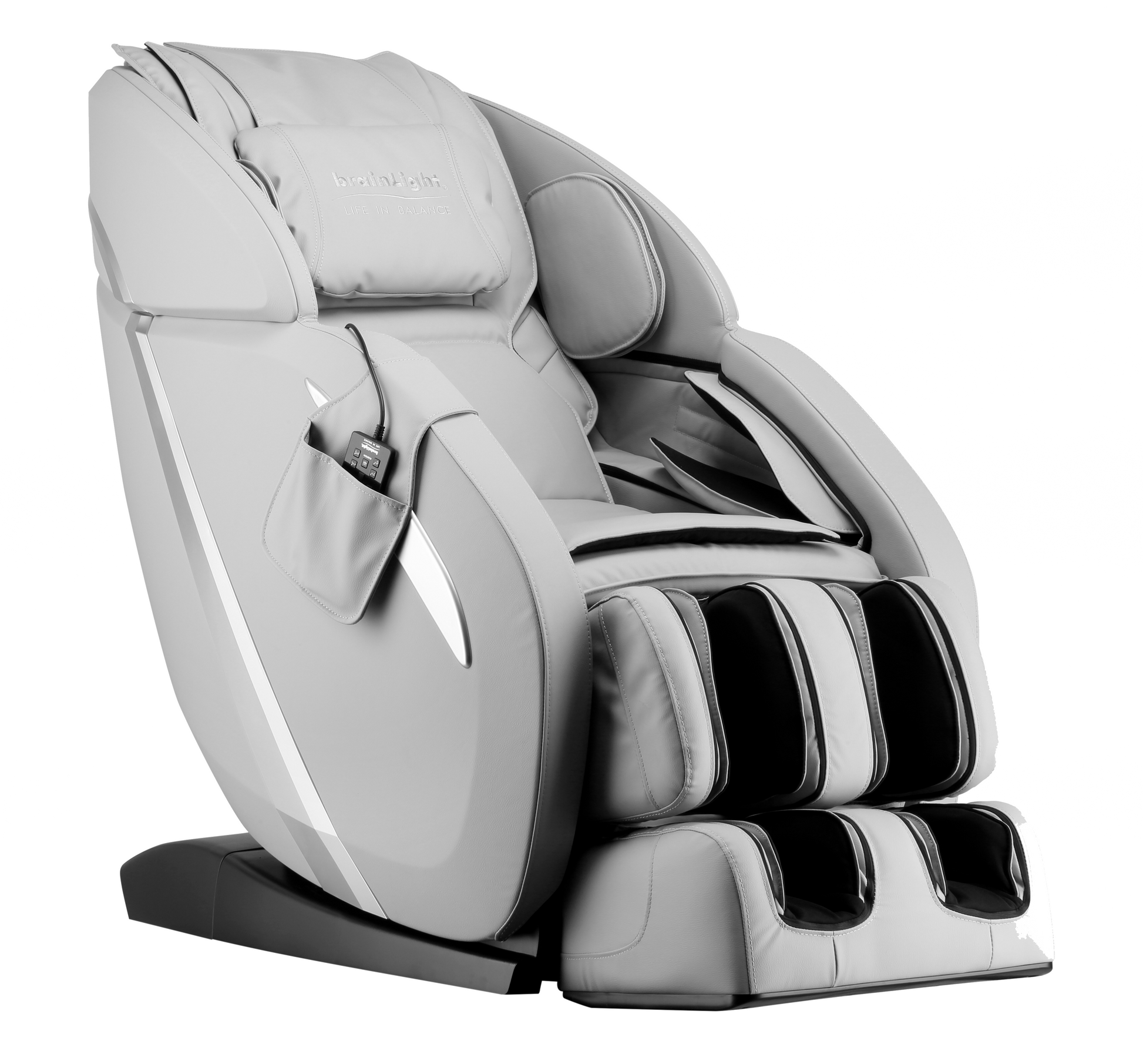 Fotel do masażu brainLight Flow łączy techniki masażu pneumatycznego i rolkowego w kompaktowej formie. Rolki masują nie tylko lędźwia, ale też pośladki i uda, zapewniając pełen relaks. Pokryty jest wysokiej jakości ekologiczną skórą z certyfikatem OEKO-Tex, dostępną w czterech eleganckich kolorach: czarnym, szarym, granatowym i czerwonym.